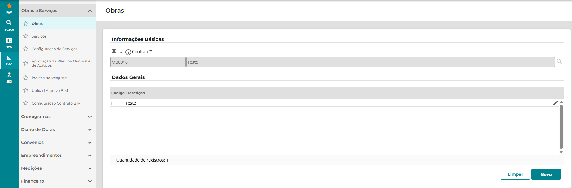 Para adicionar os fiscais na comissão da obra, no módulo SMO clique na funcionalidade ‘Obras e Serviços”, no menu lateral esquerdo. Em seguida, clique na funcionalidade ‘Obras’.