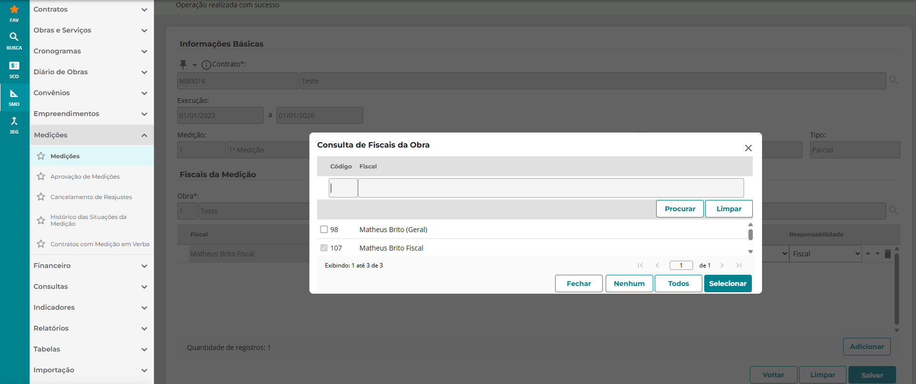Realizada a ação acima, ainda no menu SMO, clique na funcionalidade ‘Medições’ e depois novamente clique em ‘Medições’, no submenu que será aberto. Selecione a medição clicando no ícone de um ‘Lápis’, ao lado direito do título.