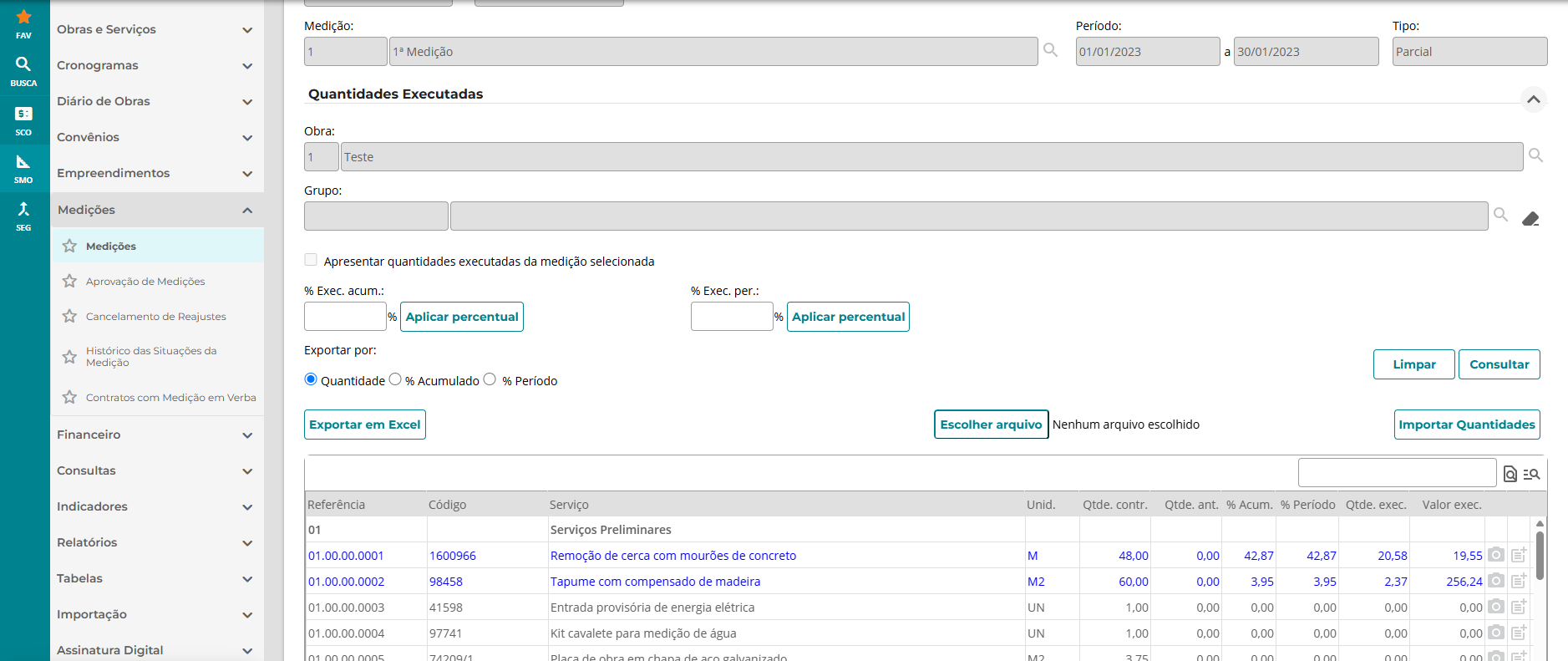 Note que ficaram disponíveis os botões ‘Exportar em Excel’ e ‘Importar Quantidades’, na parte central da tela. Também serão exibidas as opções ‘Quantidade’ ‘% Acumulado’ e ‘% Período’.