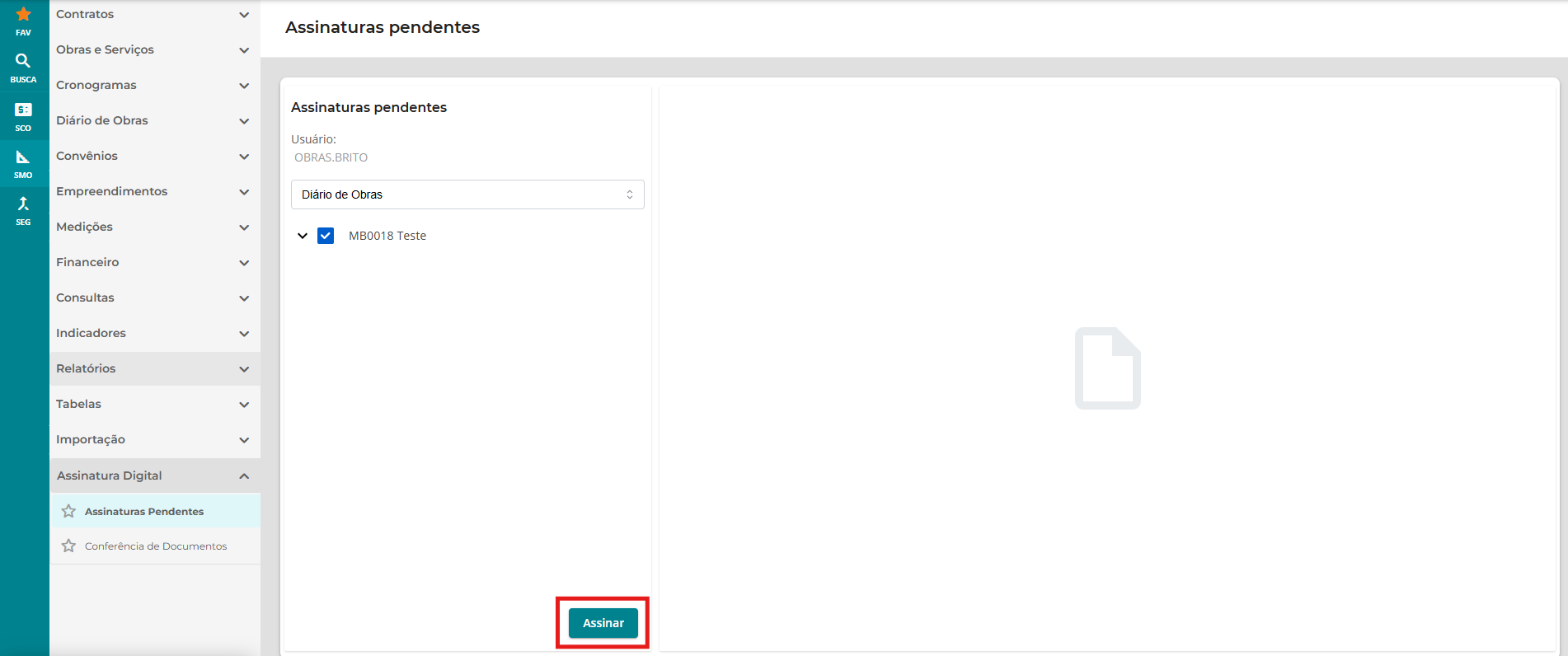 Por fim, para assinar o diário de obras também através do ambiente acessado pelo computador, é possível acessar a funcionalidade ‘Assinatura digital’, no módulo SMO, na parte esquerda da tela. Ao clicar nesta funcionalidade, clique em ‘Assinaturas pendentes’. Uma tela será exibida com os diários (e medições) que ainda precisam ser assinadas pelo usuário.