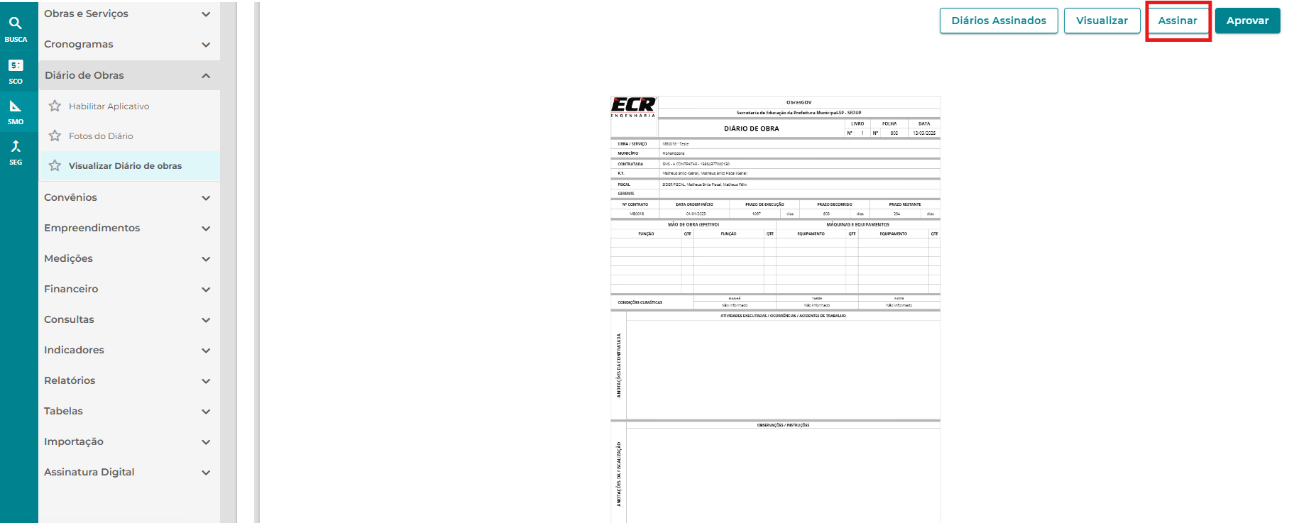 . No próprio ambiente, na funcionalidade ‘Visualizar diário de obras’, também no módulo SMO.