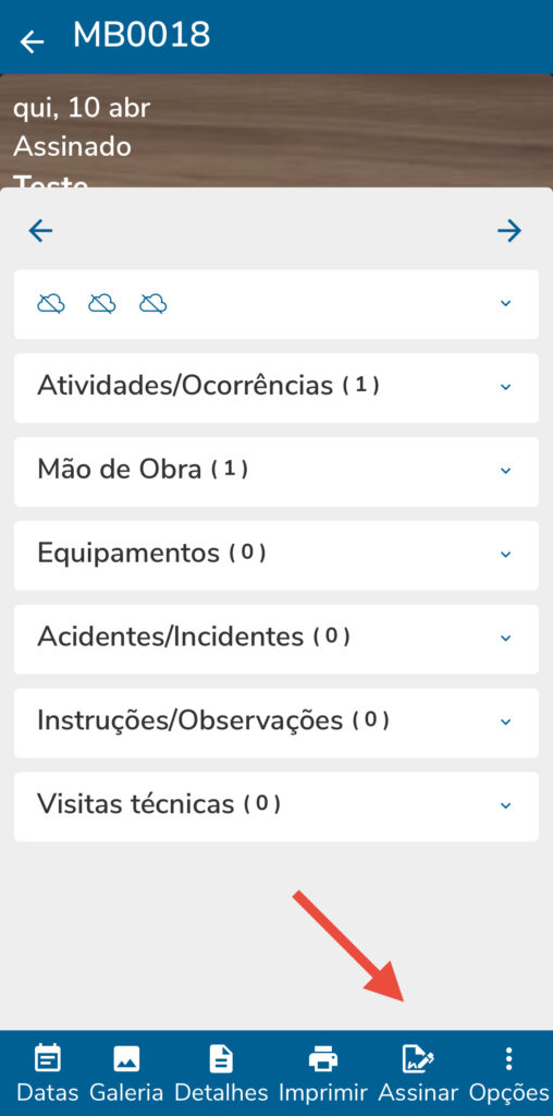 Após a aprovação do fiscal, o diário ficará disponível para que o Apontador (Responsável técnico) realize a sua assinatura. Para isso, basta pressionar o botão ‘Assinar’, no menu inferior direito, na tela do aplicativo.