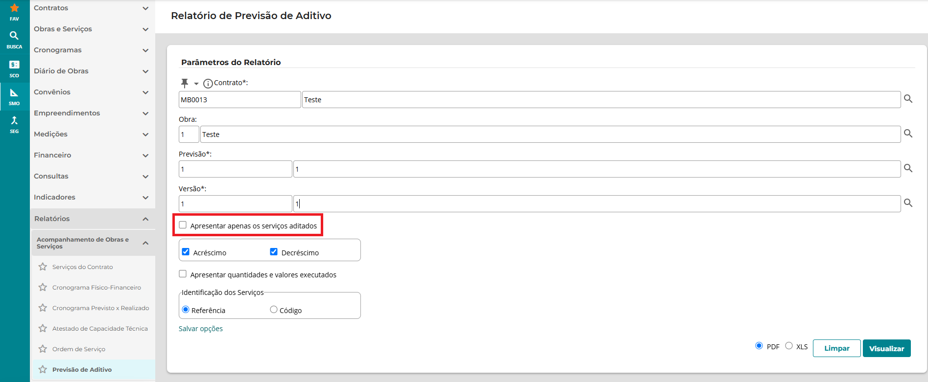 No módulo SMO, no menu lateral esquerdo, clique em ‘Relatórios’ e ‘Acompanhamento de Obras e Serviços’. Em seguida, clique em ‘Relatório de Previsão de aditivos’.