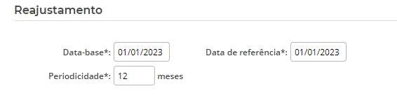 É necessário informar a data-base, data de referência e periodicidade (em meses) para o referido contrato.