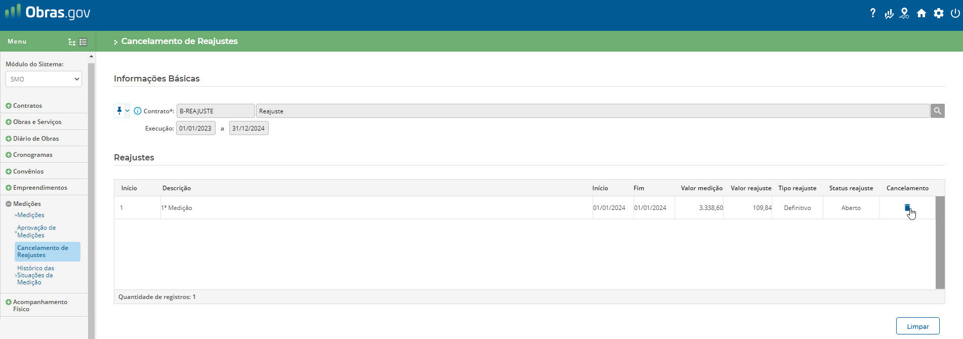 Caso seja necessário cancelar o cálculo do reajuste, basta acessar o menu ‘Medições’, e funcionalidade ‘Cancelamento de Reajustes’, clique no ícone ‘lixeira’, conforme figura 10.