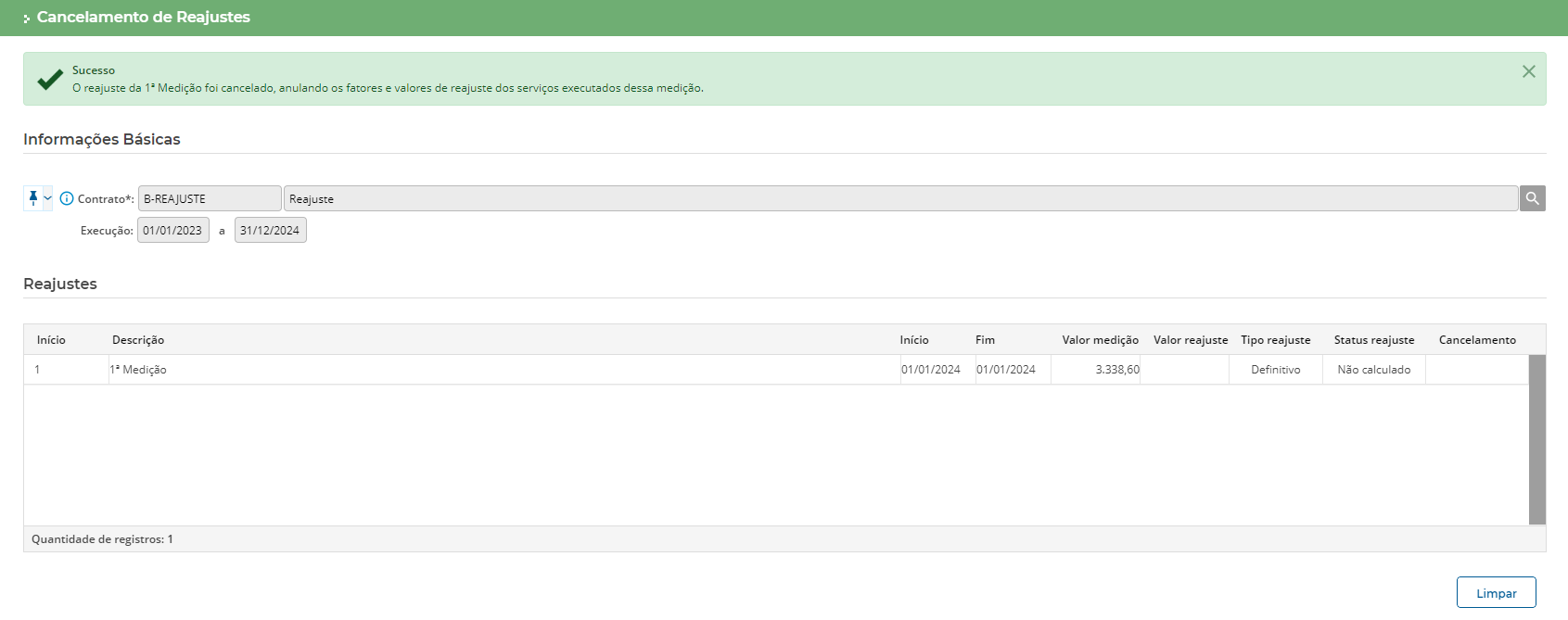 Se uma medição tiver direito a reajuste, o sistema retornará uma mensagem de ‘Medição com direito a reajuste’.