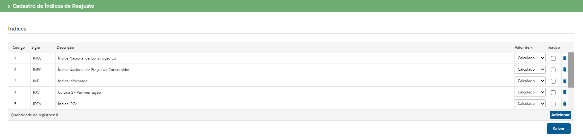 Cadastro de Índices de Reajuste