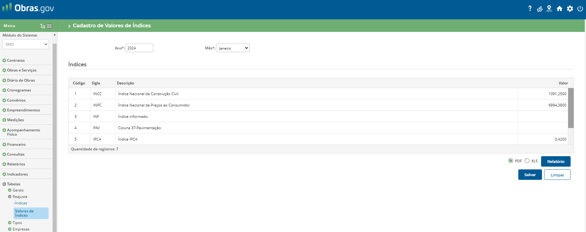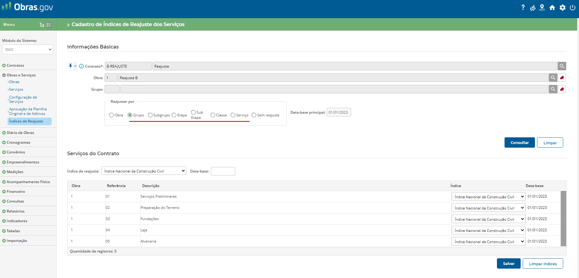 Na sequência, deve-se definir a forma de reajustamento para o contrato e associação dos índices de reajuste. Para isso, acesse o menu ‘Obras e Serviços’, funcionalidade ‘Índices de Reajuste’.