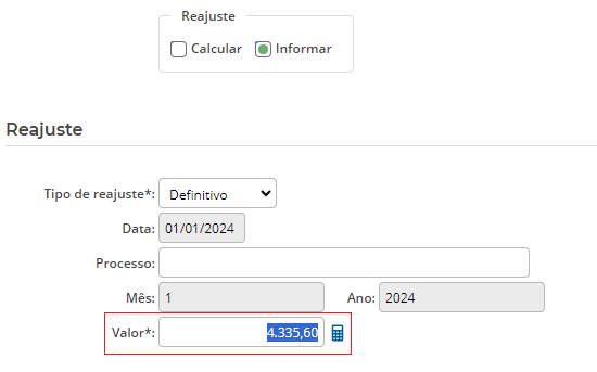 Ao selecionar a opção ‘Informar’, o usuário pode informar manualmente o valor do reajuste, conforme figura 8.