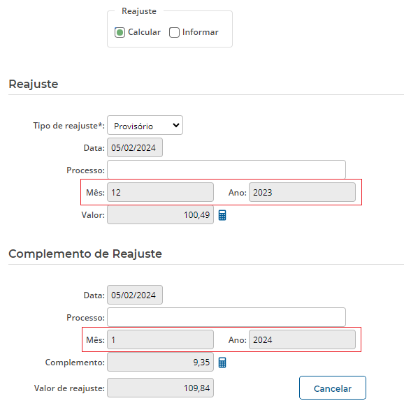 É possível cancelar o complemento do reajuste, caso necessário, para isso, clique no botão ‘Cancelar’ ao lado do campo ‘Valor de reajuste’ na seção de complemento. Dessa forma, será calculado somente o reajuste provisório sem o complemento, e caso seja concedido o complemento do reajuste, basta realizar novamente o cálculo da medição.