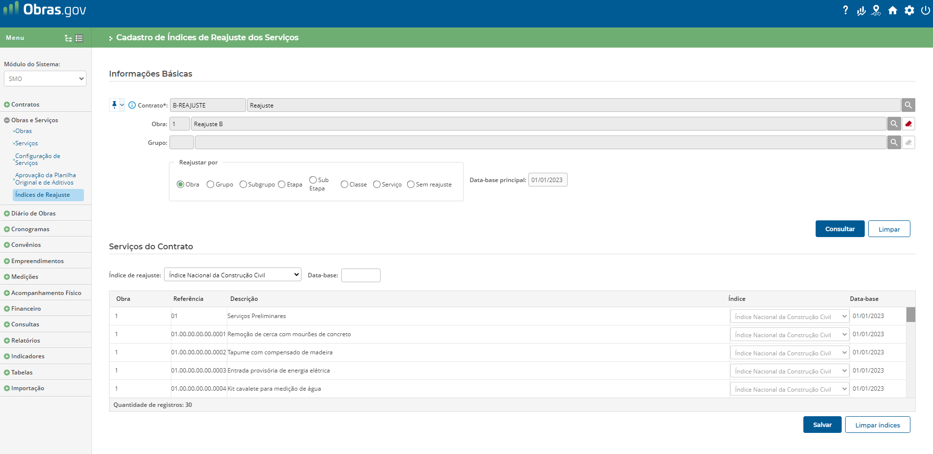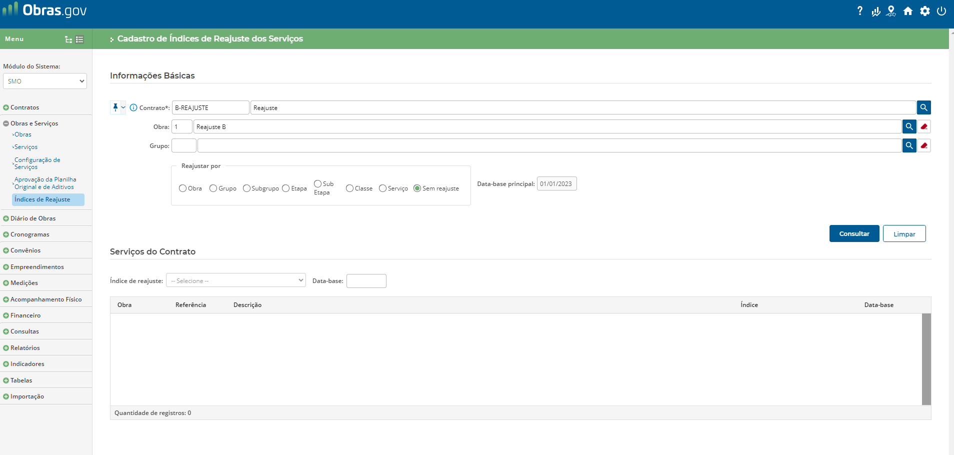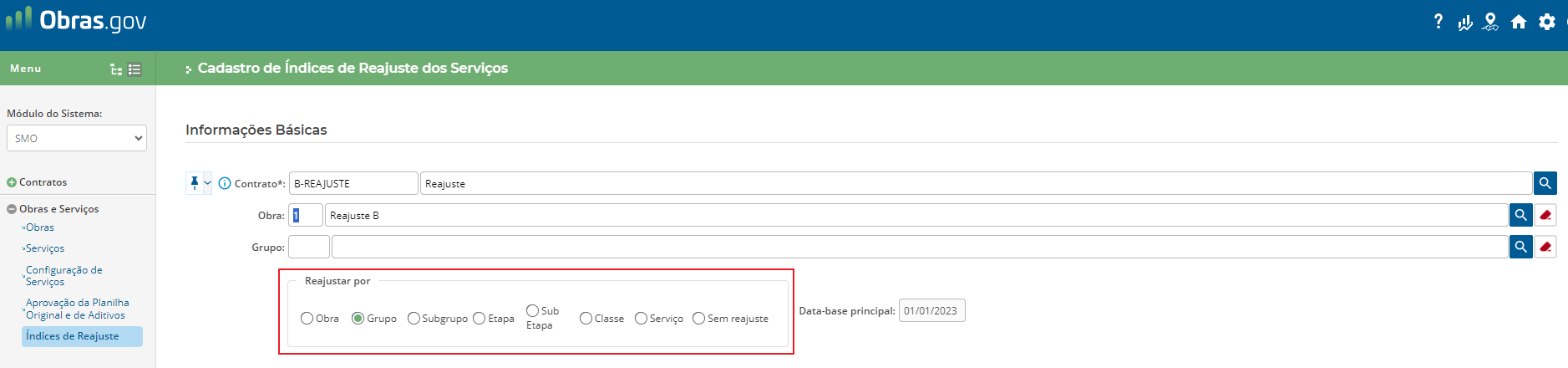 No módulo SMO, no menu ‘Contratos’ acesse a funcionalidade ‘Informações de Contratos de Obras’ e preencha os campos obrigatórios na seção ‘Reajustamento’, conforme figura 1.